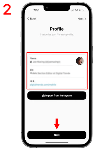 2. اگر میخواهید اطلاعات تردز و اینستاگرام شما فرق داشته باشد میتوانید اطلاعات شخصی را وارد کنید و next بزنید و یا روی گزینه import from instagram بزنید.
