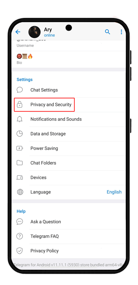 1. در تنظیمات تلگرام روی گزینه "privacy and security" بزنید.